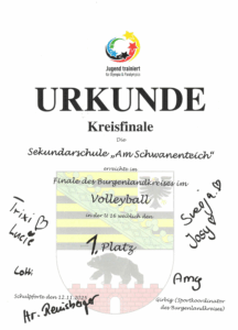 Das Team der Sekundarschule „Am Schwanenteich“ gewann das erste Spiel gegen das Zeitzer Gymnasium souverän mit 2:0. Im Halbfinale setzte sich das Team der SKS mit 2:0 gegen das Gymnasium Laucha durch. Das Finale des Tages, in dem es um den Einzug in die nächste Runde ging, spielte unsere Schulmannschaft gegen den Favoriten des Goethe-Gymnasiums aus Weißenfels. Die Favoritenrolle lag nach wenigen Minuten bei der Sekundarschule aus Zeitz. Die Volleyballerinnen konnten ohne Probleme 2:0 gewinnen und stehen in der nächsten Runde.