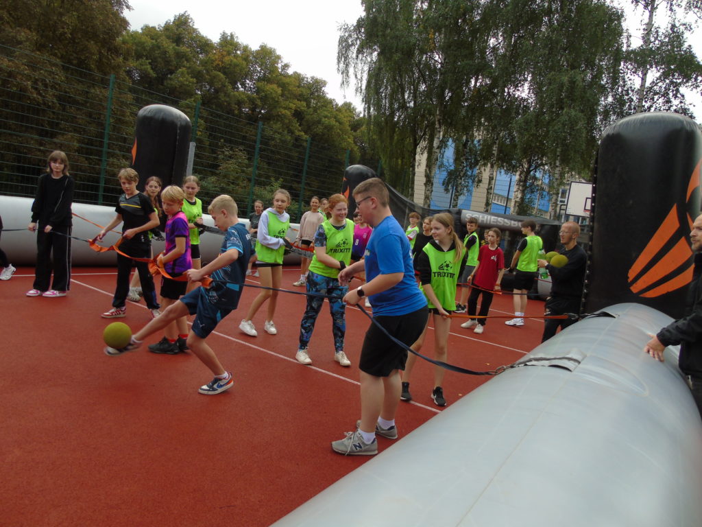 Unser Jubiläum war ein großer Erfolg. Am Morgen gab es schon das Trixitt-Projekt. Dabei absolvierte jede Klasse mehrere Stationen, wo sie gegen andere Klassen Wettkämpfe machten, beispielsweise Zwei-Felder-Ball oder einen Hindernislauf. Vieles davon fand auf Hüpfburgen statt.